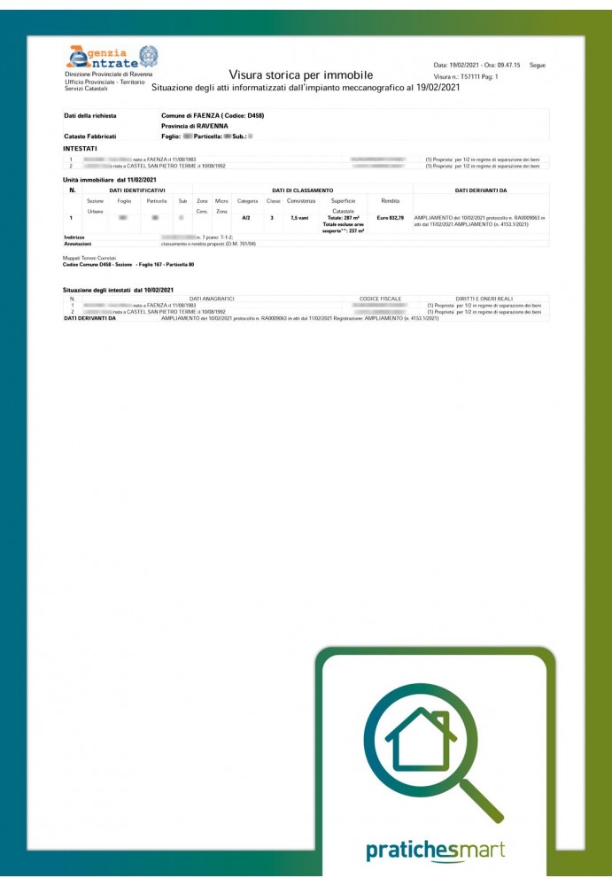 La visura catastale è un documento che rappresenta la cronistoria della titolarità dell'immobile, così come i relativi aggiornamenti planimetrici dell'unità. Inoltre, sono contenute tutte le informazioni riguardanti classamento, rendita e dimensioni.