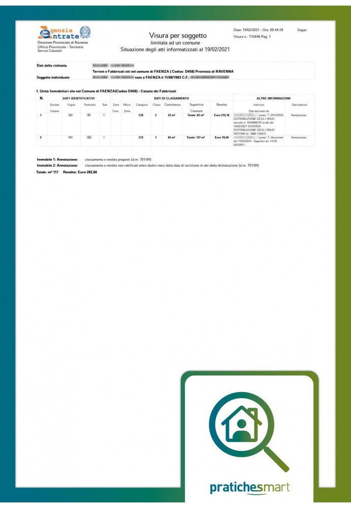 La visura catastale per soggetto propone l'elenco delle proprietà intestate ad una certa figura, sia essa un privato cittadino o una società. Gli immobili elencati presentano una serie di informazioni riguardanti, classamento, rendita e dimensioni.